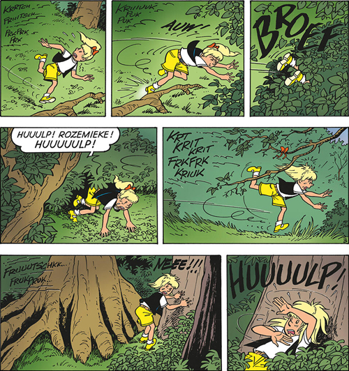 Annemieke en Rozemieke zijn op bezoek bij hun grootouders in de Ardennen. Ze hebben daar een prachtige tuin om in te spelen, maar oma en opa waarschuwen de meisjes. Ze mogen onder geen beding in het aanpalende bos gaan ronddwalen. Tijdens een spelletje verstoppertje kunnen ze het toch niet laten en gaat de tweeling op avontuur in het donkere bos. Tot ze oog in oog staan met een reuzeninsect!